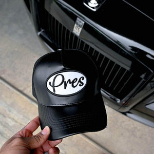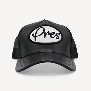 Black Leather Pres Trucker Hat, Not your average snapback. Top off your fit with this sleek and smooth black leather trucker cap. This black Gold Presidents hat styles comfortably and cool with its mesh backing and uses classic snap back adjustable straps that adjust to all sizes.