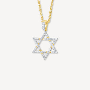 Wearing the Star of David is a great way to express yourself while also showing pride in being jewish. This hand crafted piece features solid 10k gold encrusted with hand set diamonds surrounding the Star of David. This pendant makes for a perfect gift for any occasion.