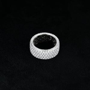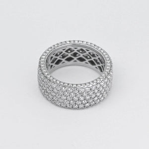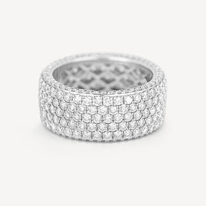 Manifest shimmering brilliance with this outspoken 7 Row 3 Sided VS Diamond Eternity Ring. The top row of this distinctive 3 sided ring is embedded with 5 repeating rows of VS Lab-Diamonds with an extra row of diamonds encompassing the visible perimeter's on each side. Produce a shine like no other with this eternity style VS diamond ring.