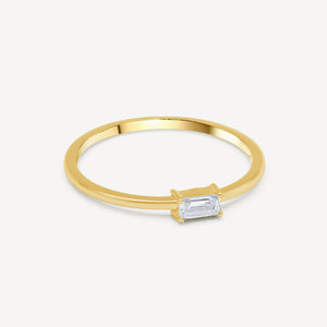 The 10k Gold Single Band Baguette Diamond Engagement Ring is a classic and elegant piece of jewelry. It features a single baguette diamond in a prong setting on a 10-karat yellow gold band. Its simple and timeless design highlights the diamond's beauty, making it a perfect choice for an engagement ring.