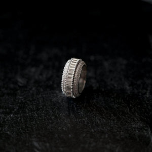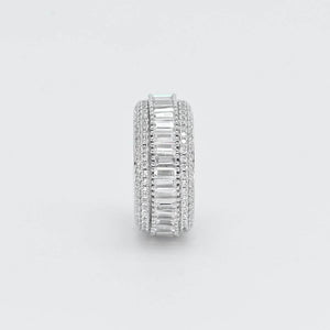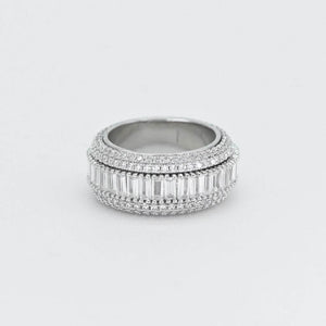 Anillo baguette de oro y diamantes de 5 capas para hombre. Este anillo baguette de oro blanco para hombre presenta una banda cubierta de oro de 18 quilates con diamantes de talla redonda en los bordes y un centro baguette en capas giratorio. Este anillo cuadrado de talla baguette es ideal para quienes les gusta lucir gélidos y elegantes al mismo tiempo.