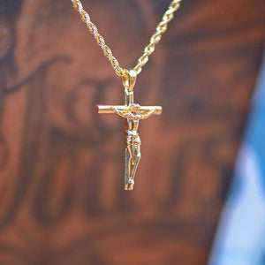 Este colgante de oro amarillo de 10 quilates representa la crucifixión de Jesús en un colgante. Esta pieza es un elemento básico para cualquier verdadero entusiasta del oro y es una manera perfecta de resaltar su fe. Con oro macizo de 10k y una artesanía intrincada, esta pieza presta atención a los detalles que importan.