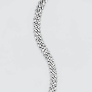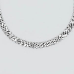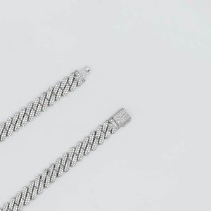 La gargantilla de eslabones cubanos con puntas de diamantes más vendida en oro blanco ahora está disponible con eslabones más pequeños de 12 mm. Muéstrale al mundo que eres el verdadero jefe con este eslabón cubano con punta de diamante. Esta cadena de eslabones cubanos presenta piedras engastadas a mano con puntas levantadas que brillan desde todos los ángulos. La cadena de eslabones cubanos es la cadena de cadenas por excelencia. Puedes seleccionar desde cadenas del tamaño de gargantilla hasta una longitud más larga. Se jacta de un diseño elegante que ofrece una declaración audaz y helada. Ya sea que quieras hacer alarde de nuestro paquete Cuban Link solo o combinarlo con otras joyas, nunca te equivocarás.