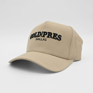 Gorra Trucker Gold Presidents en color beige, con el icónico relieve Oro | Logotipo de Pres Dallas en letras negras.