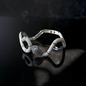 La pulsera de serpiente de diamantes en oro blanco Gold Presidents está inundada de diamantes de talla redonda. La cabeza de la serpiente presenta dos gemas a modo de ojos con piedras negras que cubren la cabeza de la serpiente. ¡Esta exclusiva pulsera de serpiente de diamantes está disponible sólo en Gold Presidents!