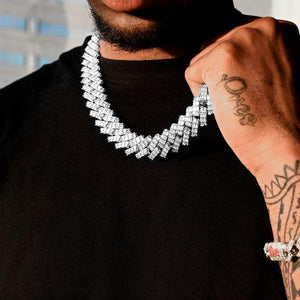 Inondée de baguettes scintillantes sous tous les angles , cette chaîne baguette à maillons cubains en diamant de 19 mm brille par son éclat glacé qui ne ressemble à aucun autre . Doté d'une épaisseur de 19 mm et d'options de longueur de 18" et 22". Achetez parmi la plus large sélection de chaînes à maillons cubains avec des présidents en or !