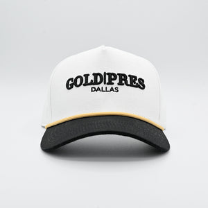 Notre chapeau Gold Pres Dallas Logo le plus vendu en blanc et noir avec des accents beiges. Comprend un snapback pour un ajustement réglable.
