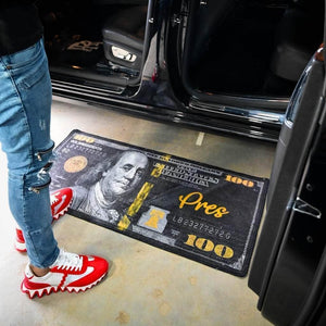 Show off your love for money with the Gold Presidents $100 Dollar Bill Black Money Rug. This detailed rug features a one hundred dollar bill intricately woven into the perfect piece of home décor. Remind yourself of why you hustle and manifest more money into your life with the Pres Money Rug!