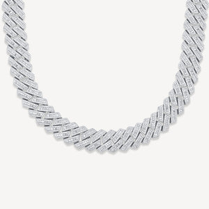 Introducing the new 19mm Diamond Baguette Prong Cuban Link Chain. This chain is featured in white gold with large prong-set stones placed on top of the chain. This Cuban Link Choker Chains to stop the party. You can also shop our wide variety of Cuban Link bracelets to match your chain. You will stand out from the crowd wearing these big links.