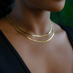 A chain with origins stretching all the way back to ancient Egyptian times. This 2mm Gold Herringbone Chain features intricate rows of interlocking woven gold links that lay flat around your neck. The herringbone necklace is the ultimate pairing chain, coordinate this chain with bracelets, rings and earrings to bring out the full brilliance of this classic piece.