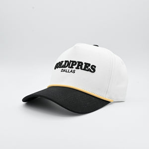 Our best selling Gold Pres Dallas Logo hat in White & Black with tan accents. Features snapback for adjustable fit.