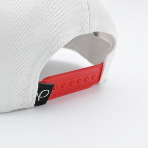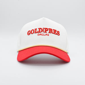 Our best selling Gold Pres Dallas Logo hat in White & Red with tan accents. Features snapback for adjustable fit.