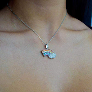 Peace, Love, and Happiness is what our newest rainbow pendant in 18k white gold brings you. It has 7 bands of colors representing the perfect rainbow. This modern jewelry piece is sure to turn heads because of its unique design.